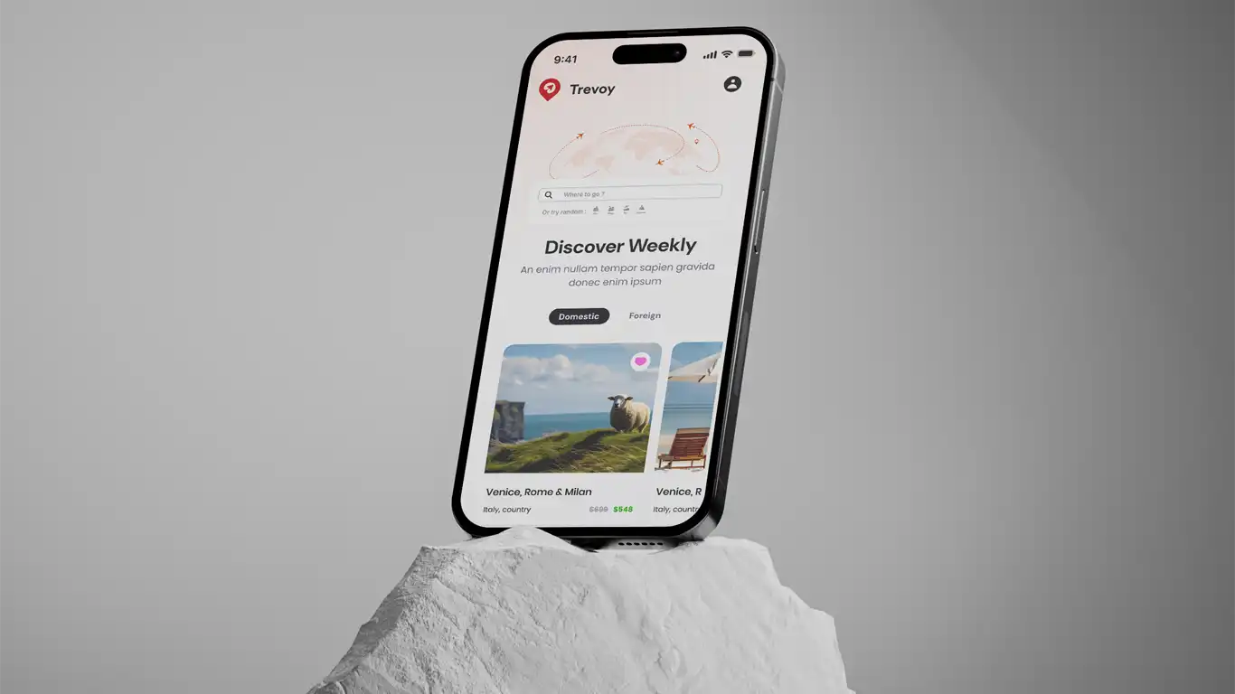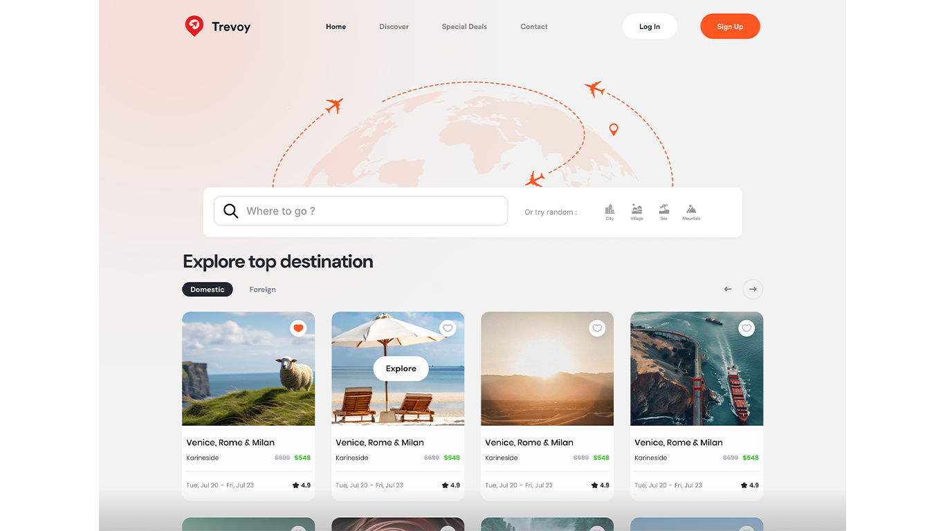 This UI design concept for "Trevoy" is clean and modern landing Page, focusing on exploring travel destinations. It features a user-friendly menus, a search bar, destination cards with pricing and ratings, and travel-themed icons for a smooth booki ng experience.